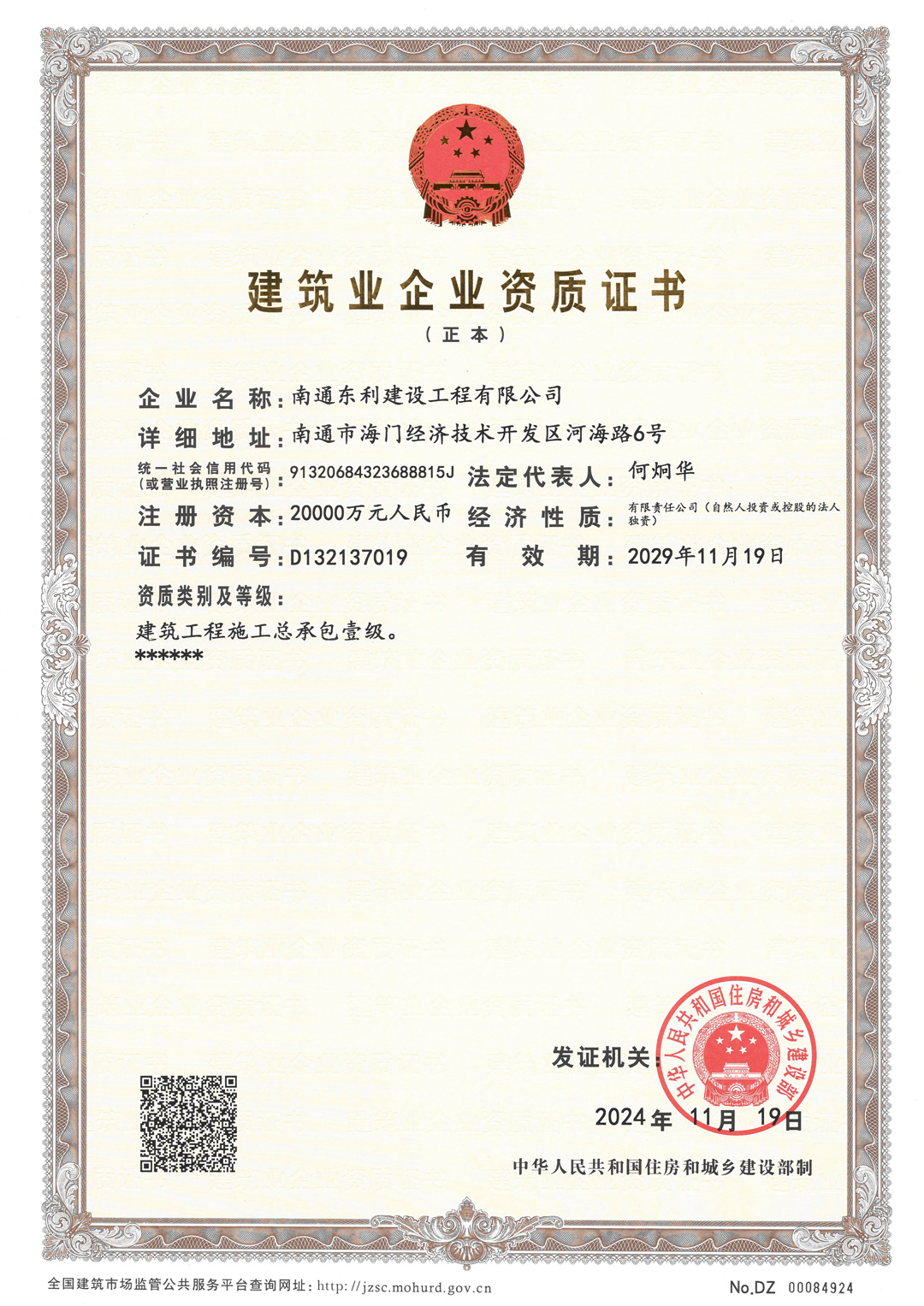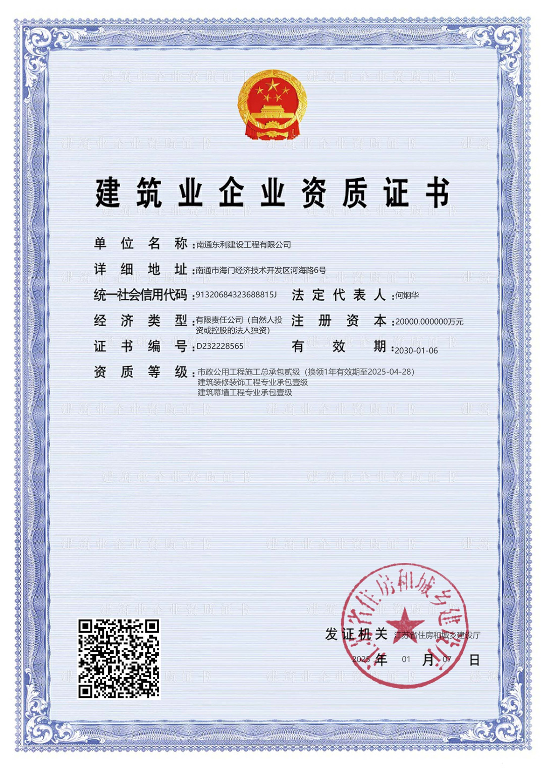 建筑工程施工總承包壹級(jí)、建筑裝修裝飾工程專業(yè)承包壹級(jí)、建筑幕墻工程專業(yè)承包壹級(jí)、市政公用工程施工總承包貳級(jí)